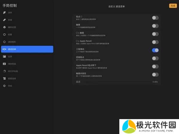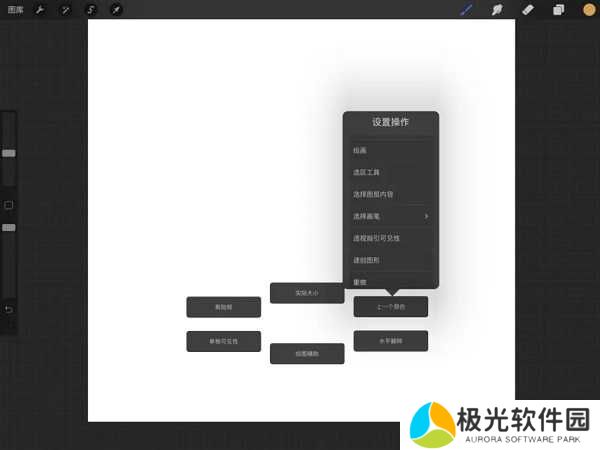 其中「速选菜单(QuickMenu)」是一个重要的工具,默认是没有触发方式的,你需要自己分配一个手势启用它,比如这里我选择的是三指向下滑动来触发。「速选菜单」中有六个选单,长按其中一个选单即可自定义内容,根据习惯的不同你可以将之用于快速切换常用画笔或者是作为常用功能的快捷唤出方式,这对减少繁琐操作很有帮助。