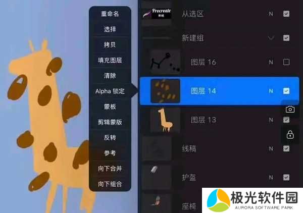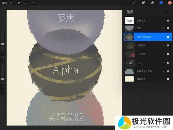而「Alpha 锁定」是另一种图层属性,打开「Alpha 锁定」的图层将锁定所有透明区域,只允许对有内容的部分进行填涂绘制和修改。和作为额外元素叠加在画面上的「蒙版」以及「剪辑蒙版」不同,「Alpha 锁定」状态下对图层内容的修改是有破坏性的,是对当前图层内容的直接修改。