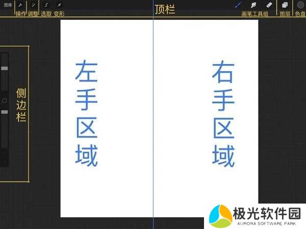 Procreate 的界面布置相当简洁,顶栏的内容被分成了左右两个区域,各分配给左右手五个不同的功能按钮,而除了顶栏以外就只有一个简单的侧边栏。