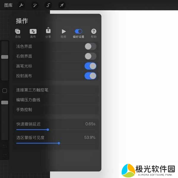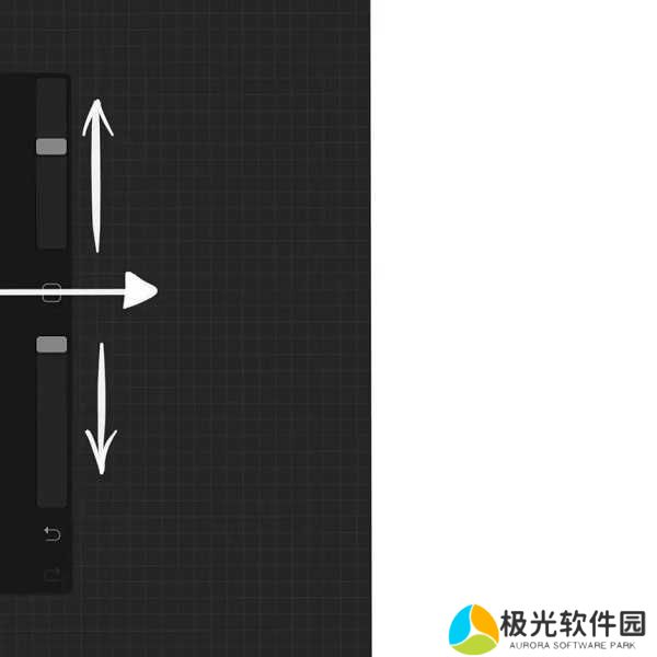 侧边栏可以快速调节当前所用画笔:上半部分的滑条调整当前画笔尺寸、下半部分改变画笔的透明度、中间的矩形默认可以用于打开取色器,你也可以在偏好设置中将其改为别的快捷按钮。侧边栏最下面的是撤销和重做按钮,按住撤销按钮会启用「快速撤销」——自动执行多次撤销操作。
