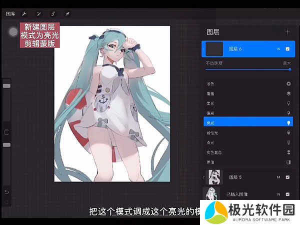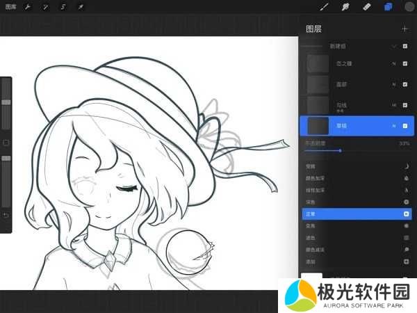 顺便一提这里的「N」指的是当前图层的混合模式为「正常(Normal)」,我有时会将勾线用的图层改为「强光(Hard Light)」好让底稿线条在勾线中可见。在图层编辑菜单中你可以改变当前所选涂图层的混合模式,这些选项和你在许多专业图片处理软件中所见过的图层特效基本一致,如果你想要更详细地了解这些混合模式选项的具体含义,你可以参考 Procreate 官方文档对「混合模式(Blend Mode)」的解释。