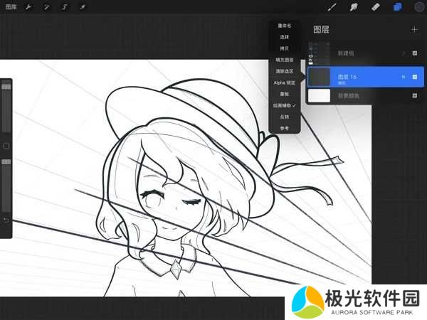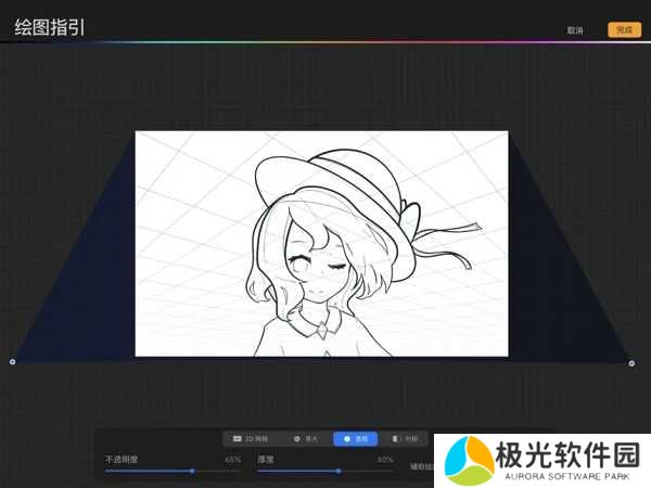 「绘图指引」能够设置成多种不同形式的辅助线网线,除了普通的平行网格外,还有等边三角型格线、透视线、对称轴线。在图层操作菜单中开启「绘图辅助」后,在该图层绘图时画笔的走向会自动按照网格方向进行。
