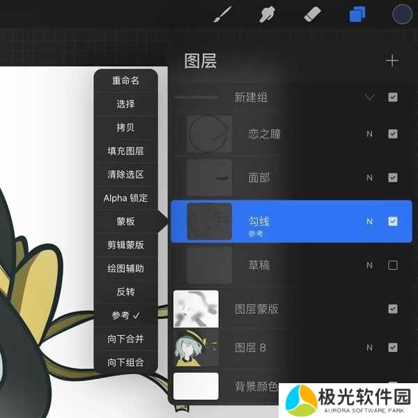 但是如果你在一些有着复杂图层关系的绘画中使用「色彩快填」很可能会屡屡受挫,毕竟这个功能正常是不能跨图层识别画笔边缘的。这时你需要的是点击当前所选图层选项,弹出图层的操作菜单,打开「参考」。打开「参考」的图层能够在任何其他图层中依然被「色彩快填」识别边缘并填色,在画漫画和大色块风格的作品中这项功能相当实用。