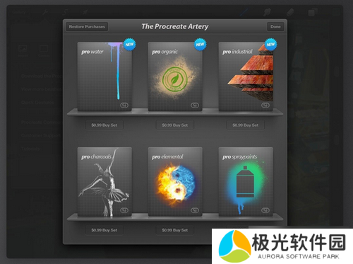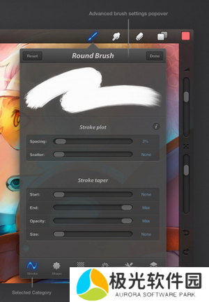 事实上,软件内本身提供的笔触已经比较全面,内购中也包括了 9 大类 72 种新笔触。不过像开发人员自己说得,这些笔触完全可以客户化设置出来。下图是应用中购买笔触的界面。购买笔触前,应用提供了一个界面可以尝试各种笔触的效果,很贴心。