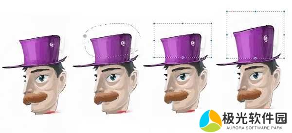 4、选区的内容还支持自由缩放拉伸。有什么用呢?请看下图。我画了这位大胡子绅士的礼帽后觉得礼帽似乎不够高可又懒得擦掉重画,怎么办 ? 很简单!只要你用选区工具选中要拉伸的帽子上部,再用选择工具就可以手动拉长礼帽了。