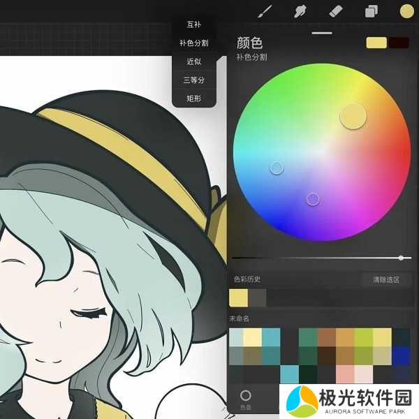 勾线完成后,就可以开始构思初步的配色方案了。在你的配色方案中使用补色来调整配色方案经常能让画面色彩更加协调和平衡,而 最新版本更新后色盘中增加的「颜色调和」就是配色时一个非常实用的工具,你可以通过它快速查找某一个颜色的补色、近似色。