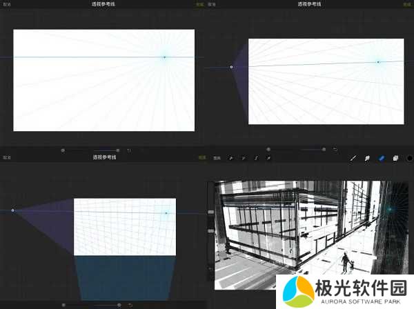 5、透视辅助功能。你可以设定开启一点、两点或三点透视,然后你画的线条就会自动沿着透视线变得笔直而准确。从此画场景建筑跟玩儿似的,妈妈再也不用担心我透视不准了。