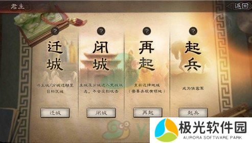 在君主选项中,可以看到对城池的操作选项,分别是“迁城”、“闭城”和“再起”。点击“迁城”并选择目标区域即可完成迁城操作。