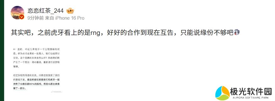 直播吧12月10日讯 近期iG官宣了重组,并组建了全神班阵容,氧望体育创始人安杰也接受了国内媒体的专访。对于专访的内容,恋恋红茶感慨到,此前虎牙在投资iG之前是投资RNG,两个战队从好好合作到现在对簿公堂,只能说缘份不够吧!