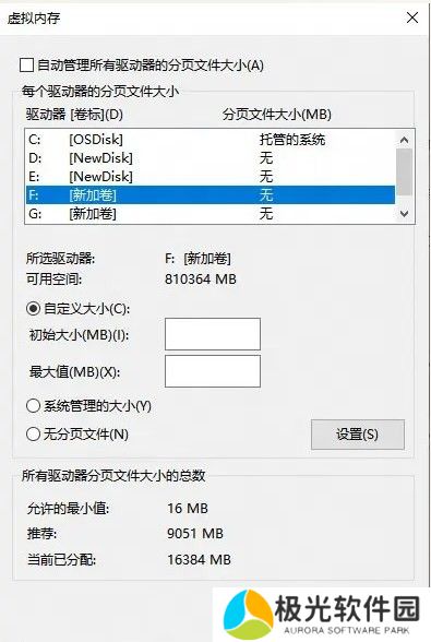 4.取消勾选管理所有驱动器的分页文件大小,选择需要分配虚拟内存的硬盘,一般为设备本身物理内存的1.5倍左右到2倍左右,可以根据实际情况进行调整,调整后保存并重启电脑即可。