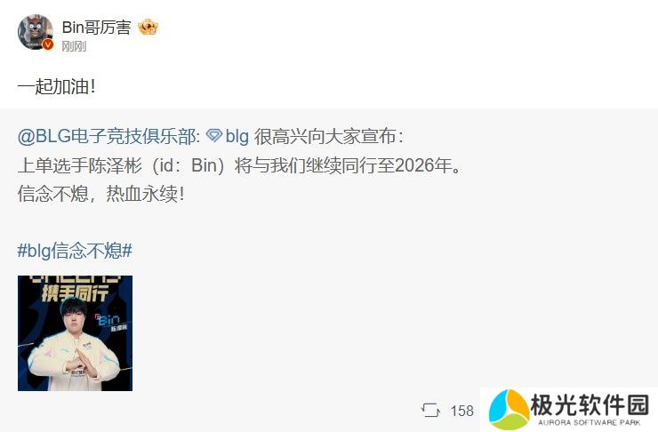 直播吧12月5日讯 今日BLG官方官宣与Bin选手续约,Bin转发续约公告,并配文:一起加油!