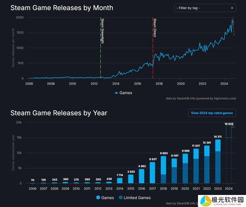 根据SteamDB的数据显示,2024年Steam上共发布了18,825款游戏,比2023年的14,311款有了大幅提升,创造了新纪录,这其中2024年10月当月Steam上就发布了1,901款游戏,为历史之最。