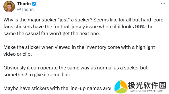 “为什么Major赛事的贴纸只能是一张贴纸呢?除了那些铁杆粉丝以外,选手贴纸就像是足球队的队服一样,如果它跟之前的贴纸对比看起来99%都一样,那普通粉丝可能就没兴趣继续消费了。