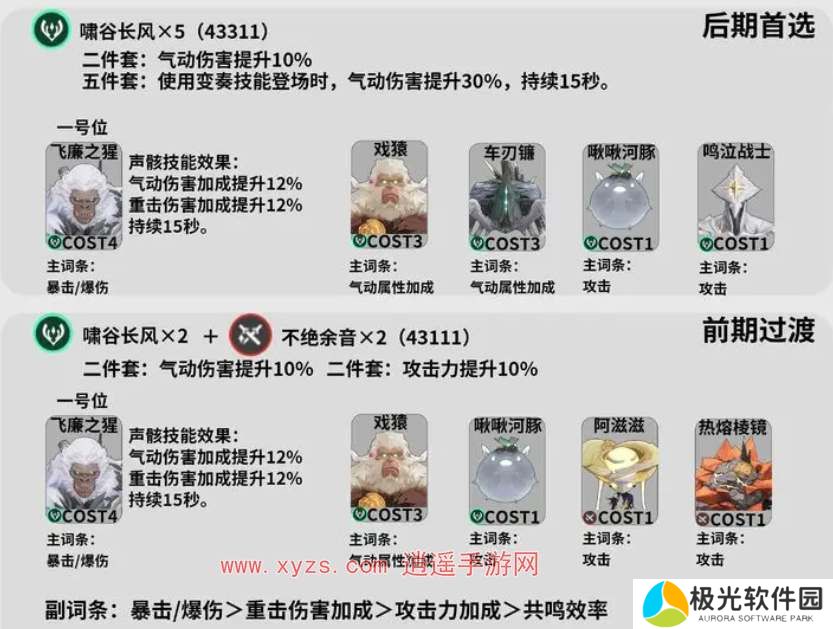 中后期推荐首先选择5套装啸谷长凤。cost级别及其声骸种类可以参考一下下面搭配在一起。