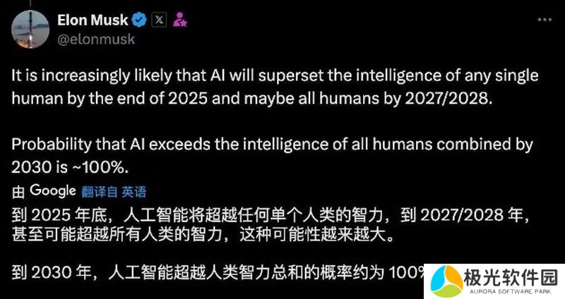 马斯克还强调,随着时间的推移,AI超越所有人类智力的趋势将愈发明显。他预计,到2030年,这一概率将逼近100%,标志着AI智力全面超越人类的新时代的到来。