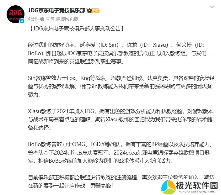 直播吧12月10日讯 官方消息,JDG俱乐部在刚刚公布三则人员变动公告;Sin、Xiasu、BoBo三名教练加入教练组。