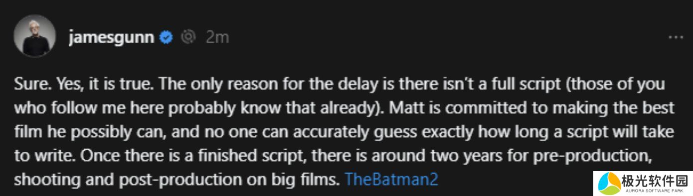 DC影业联合总裁詹姆斯·古恩表示,由于剧本尚未完成,《新蝙蝠侠2》上映推迟,现已改为2027年10月1日上映,2025年夏末开始制作。