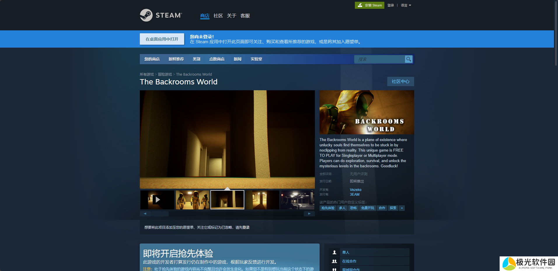 Steam平台需要先安装Steam平台,之后注册一个账号登录,然后搜索“The Backrooms World”进入商店购买页面。