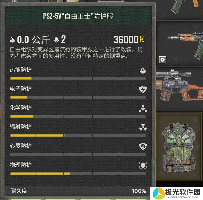 《潜行者2:切尔诺贝利之心》中的PSZ-5V“自由卫士”防护服是游戏里非常好用的装备,这个防护服是自由组织对变异区最流行的装甲服之一进行了改装,优先考虑各方面的多用性,没有任何特定的侧重点。