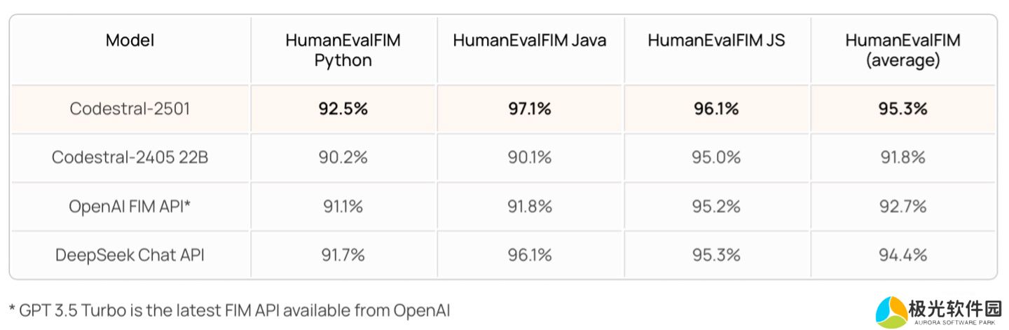Mistral AI 声称,Codestral 25.01版本在 Fill-In-the-Middle(FIM)任务中刷新了多项基准测试记录,特别是在 FIM 的 Pass@1 测试中,平均通过率达到 95.3%,显示出该模型在生成单行代码方面的强大能力。
