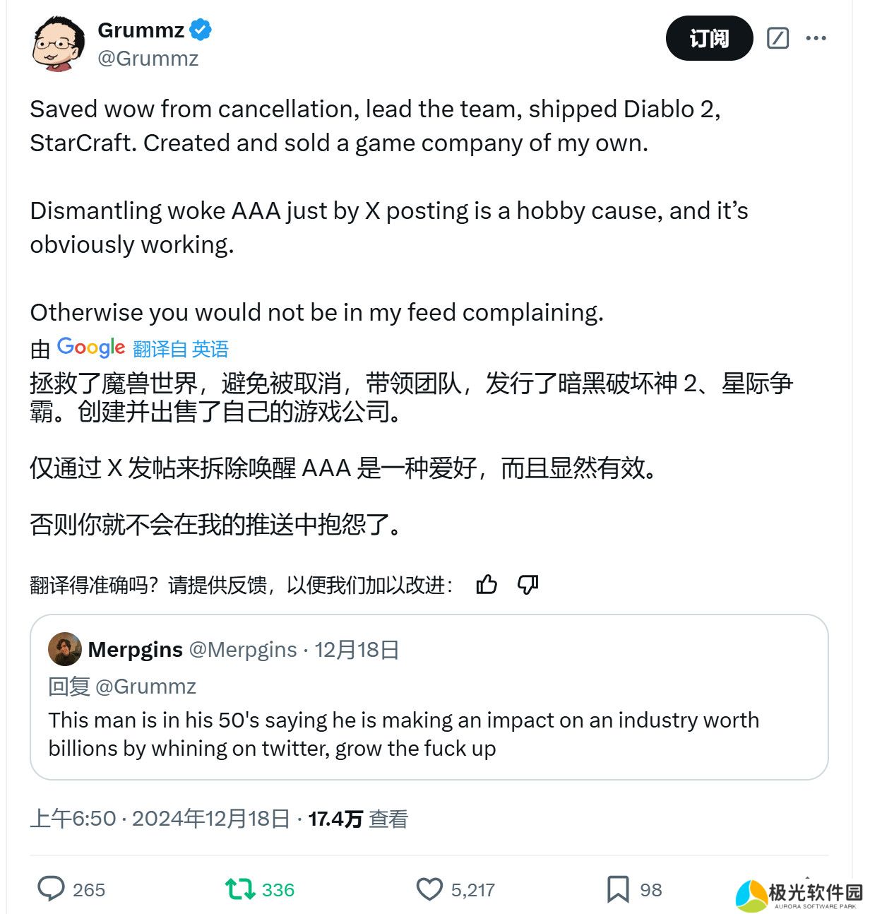 在被指责50多岁一事无成后,Grummz反驳了这名玩家,他说:“我曾拯救了《魔兽世界》,避免它被暴雪取消,带领了团队,推出了《暗黑破坏神2》、《星际争霸》,创建并出售了自己的游戏公司。只靠X发帖就把觉醒3A游戏拆得七零八落是我的爱好,而且显然很有效。否则你就不会在我的推文中抱怨了。”