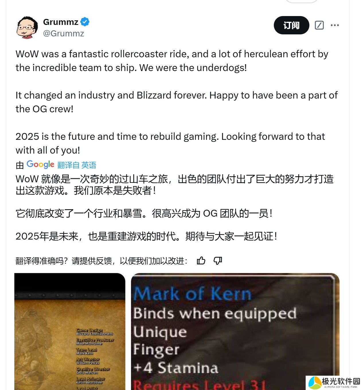 对于玩家的怀疑,Gummz继续发帖,晒出一张图片,显示Mark Kern确实是《魔兽世界》的团队领导(team lead),甚至游戏中还有以他名字命名的装备。