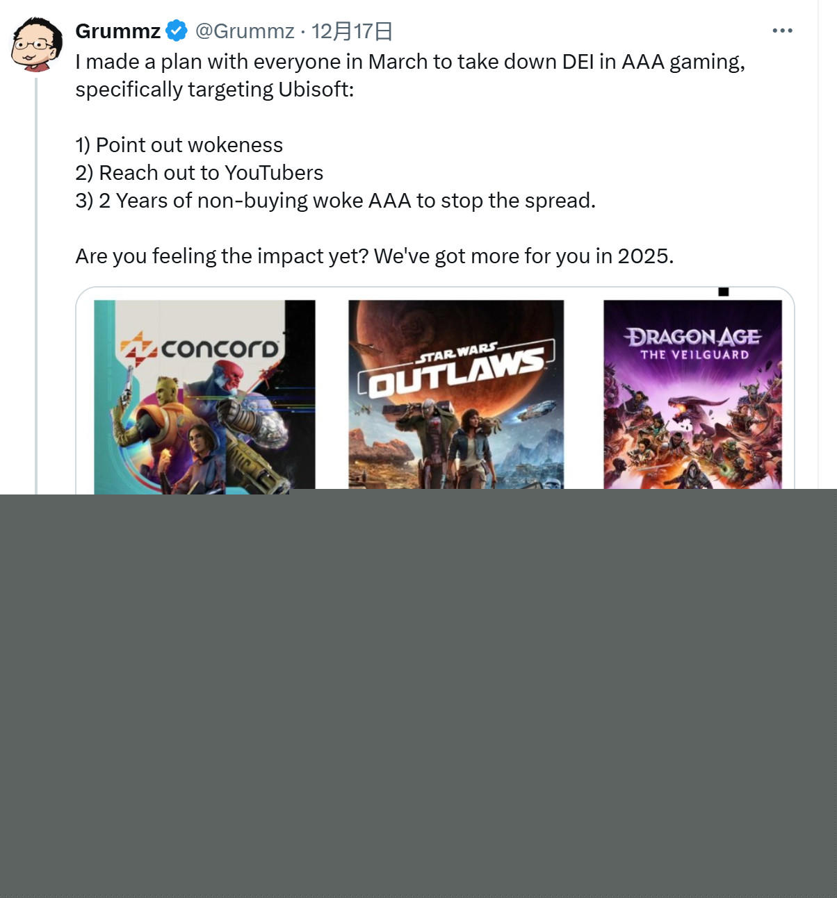 Grummz还列出了三步走步骤:指出woke元素——联系油管自媒体人士——2年内不买阻止扩散。Grummz表示2025年回“继续战斗”。