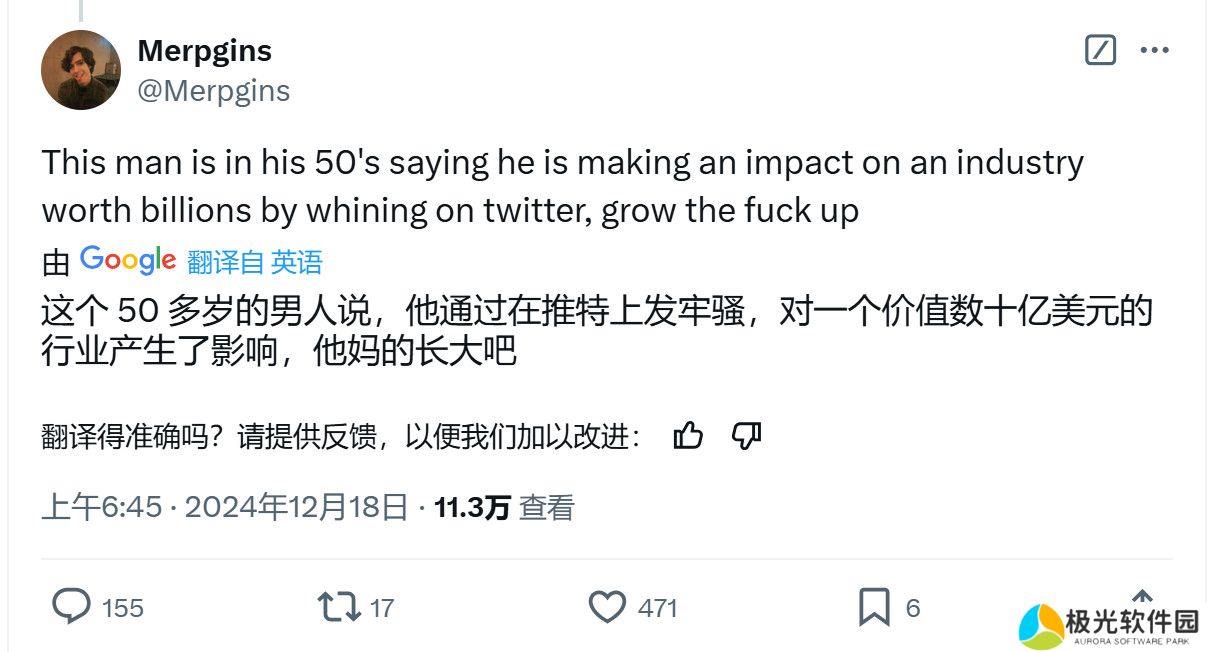 他的这一发帖获得了43万次观看,证明有了不小的影响力,评论区有大量玩家感谢Grummz。但也有玩家称“这个人都50多岁了,竟然还说仅在X上发牢骚就对价值数十亿美元的游戏行业产生了影响,赶紧TM地快长大吧。”