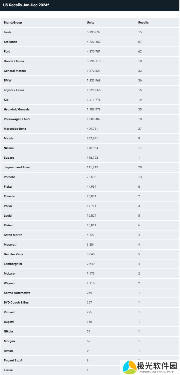 本站 12 月 23 日消息,据 Carscoops 报道,美国汽车行业 2024 年度召回排名出炉,特斯拉超越连续三年“蝉联”榜首的福特,成为年度召回车辆数最多的汽车品牌。此前福特曾连续三年(2021 年起)成为美国召回情况最严重的汽车制造商,而今年,特斯拉和 Stellantis 的“崛起”改变了这一局面。