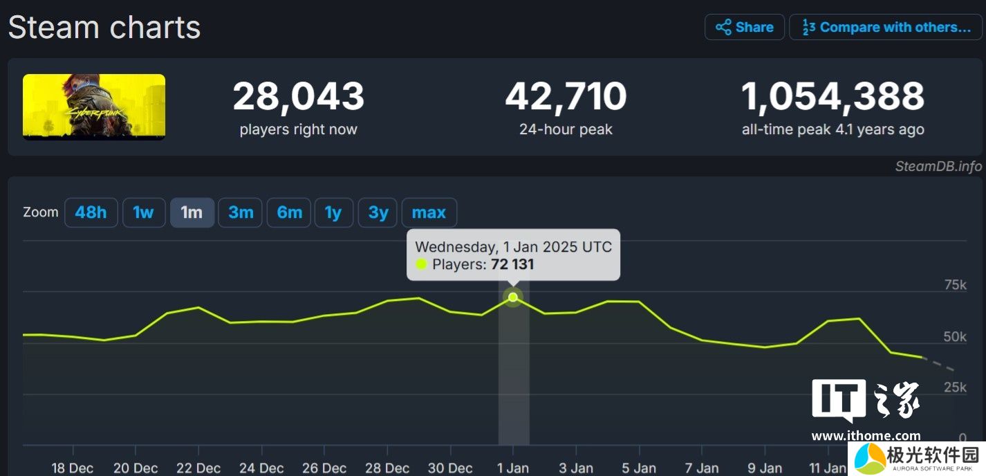 正因如此,即使在 2025 年,《赛博朋克 2077》的玩家基数依然强劲。根据 Steam 平台的数据显示,2025 年 1 月 1 日,该游戏的在线玩家数量突破了 7.2 万人,并在一段时间内保持了平均 7 万人的水平。尽管随后略微下降至 5 万人,但这一数据依然相当不错。