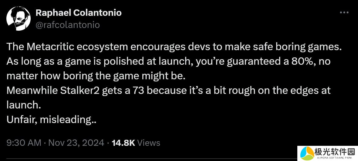 虽然《潜行者2》确实不够精致,但Raphael Colantonio似乎更看重创意和创新。这句话来自一个游戏行业的总监和创意人士之口,这并不令人意外。这也不是第一次有开发者公开反对Metacritic评分的重要性。