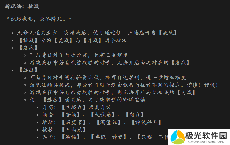 ·各位天命人通关至少一次游戏后,便可通过任一土地庙开启【挑战】。挑战共分为【复战】与【**】两个玩法