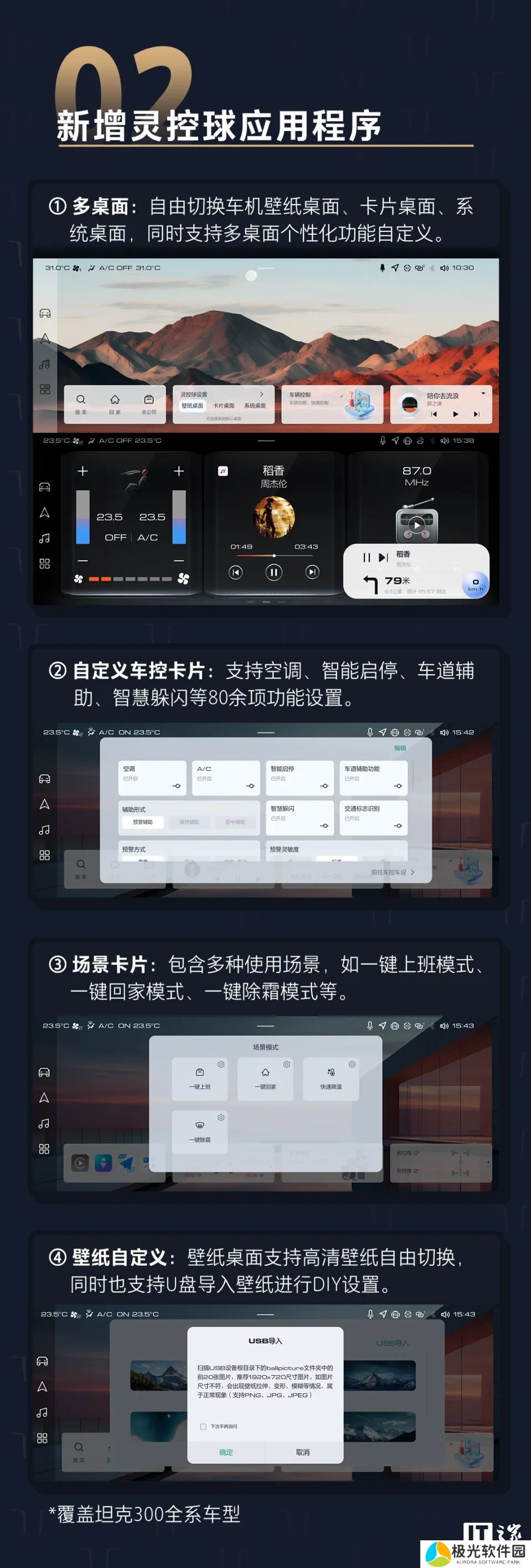 多桌面:自由切换车机壁纸桌面、卡片桌面、系统桌面,同时支持多桌面个性化功能自定义