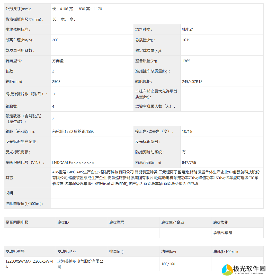 新车长 4106mm,宽 1830mm,高 1170mm,轴距 2503mm,整备质量 1365kg,最高车速 200km/h,搭载 70kW (额定功率)/160kW (峰值功率) 驱动电机和三元锂离子蓄电池,配备 ABS 和 EDR 系统。