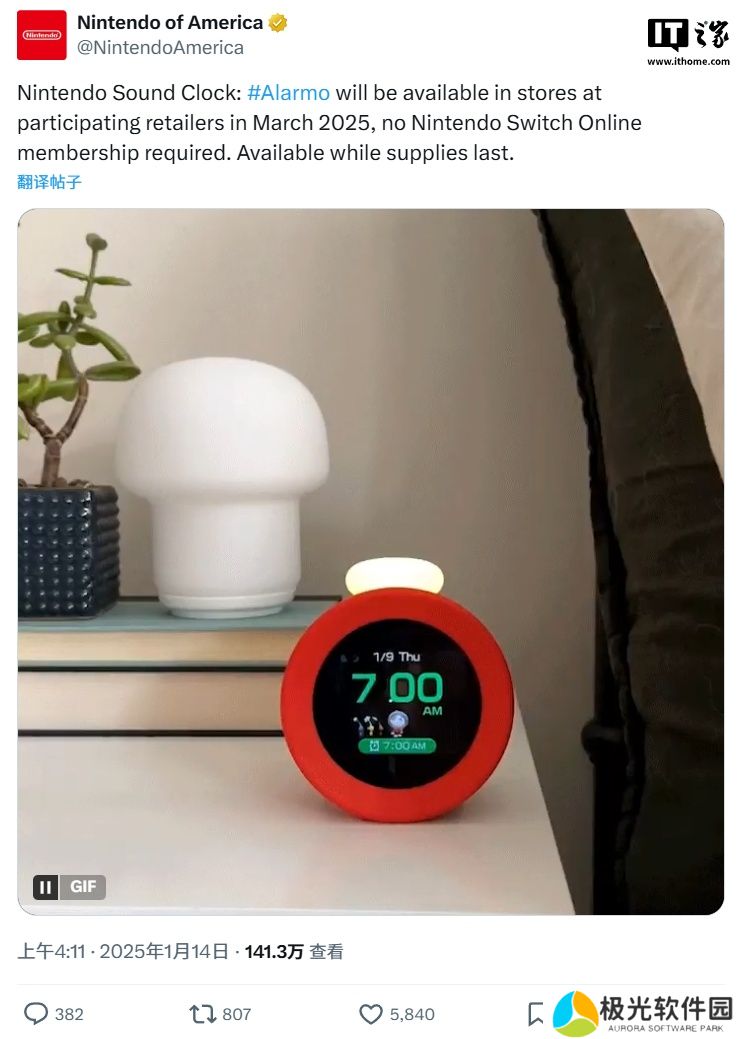 本站 1 月 15 日消息,任天堂美国官方 X 账号 14 日宣布,其“Alarmo”体感闹钟将于今年 3 月在“参与零售商的商店”开售,用户无需订阅 Nintendo Switch Online 或前往任天堂实体店。