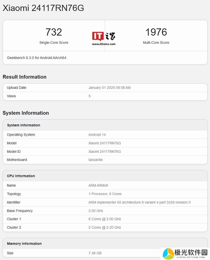 该机型号为 24117RN76G,末尾的“G”代表国际版本。该机运行安卓 14 系统,配备 8GB RAM(Geekbench 显示为 7.48GB),预计正式发布时可能提供更多内存选项。