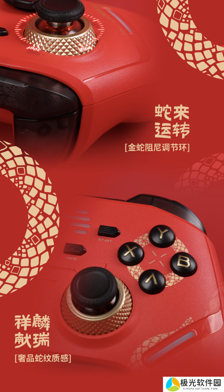 北通鲲鹏 40 手柄“巳蛇限定版”的外壳采用红色主题,印有蛇纹元素丝印;手柄摇杆和按键处均有金色点缀装饰,同时附送新年限定贺卡。