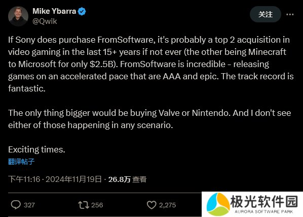 他对 FS 社给予了高度评价,写道:“FromSoftware令人难以置信 ——以更快的速度发布 3A 级的史诗游戏。过往的记录非常棒。”他继续说道:“唯一更大可能更大的收购就是 Valve 或者任天堂。我看不到这两种情况发生的可能性。”