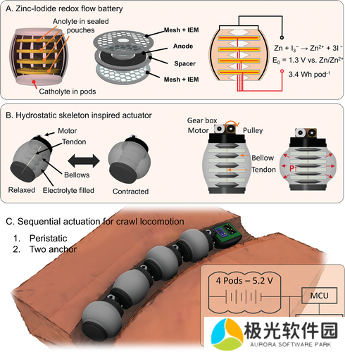 机器水母的氧化还原液流电池配备了一根肌腱,当肌腱弯曲成钟形时,机器人会向上推进;而当肌腱放松时,机器人则会下沉。实际运行的视频显示,其在水中游动时呈现出类似真实水母的动作。而模块化蠕虫机器人则由多个类似大型蛇形机器人中常见的模块化单元组成,每个单元都包含一个电机和一个肌腱驱动器,通过伸缩来实现运动。
