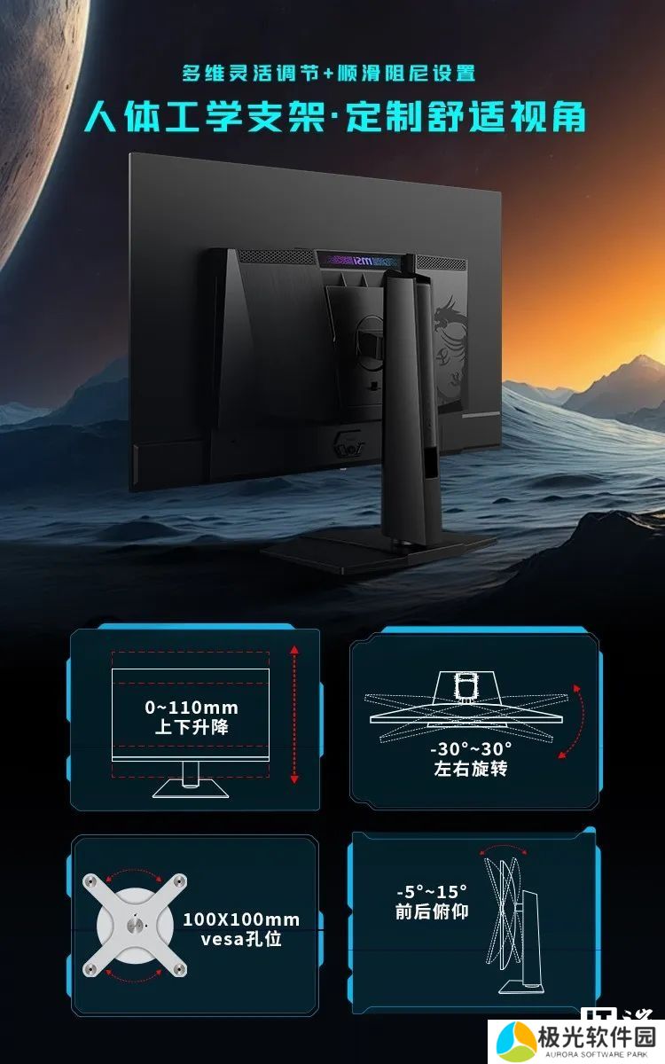 在支架上支持上下升降、左右旋转以及俯仰调节,由于采用的是标准 VESA 孔距,所以也能安装显示器支臂用。