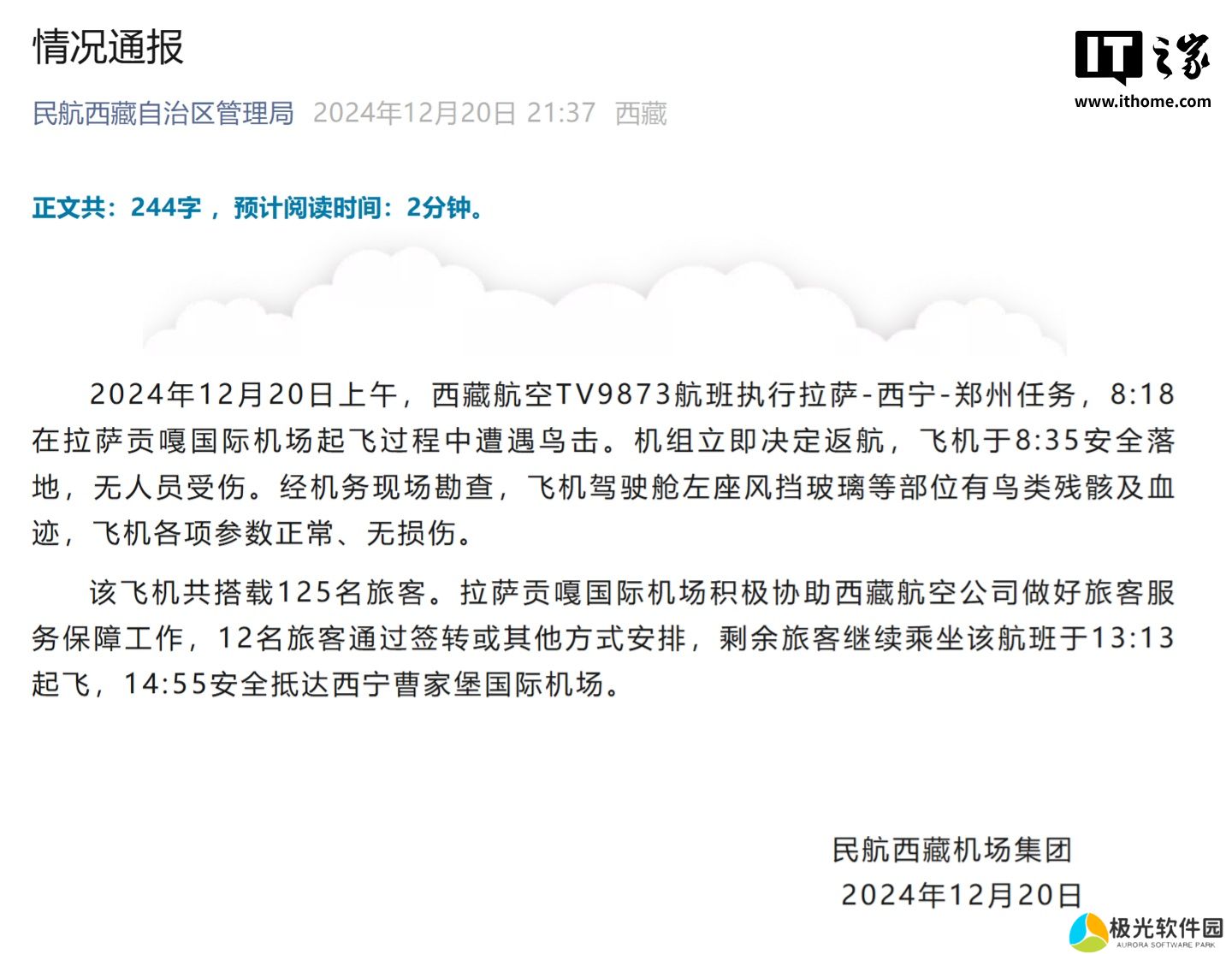 本站 12 月 20 日消息,西藏航空TV9873航班今日起飞后返航,民航西藏机场集团今晚发布情况通报。