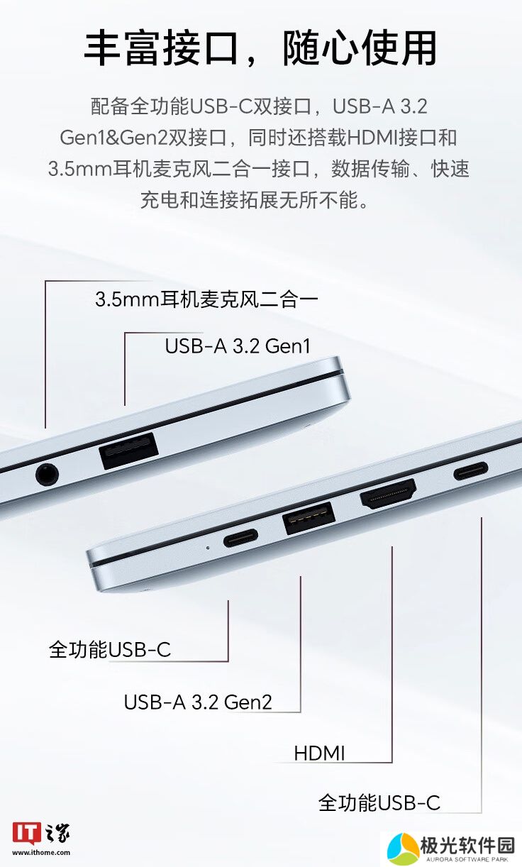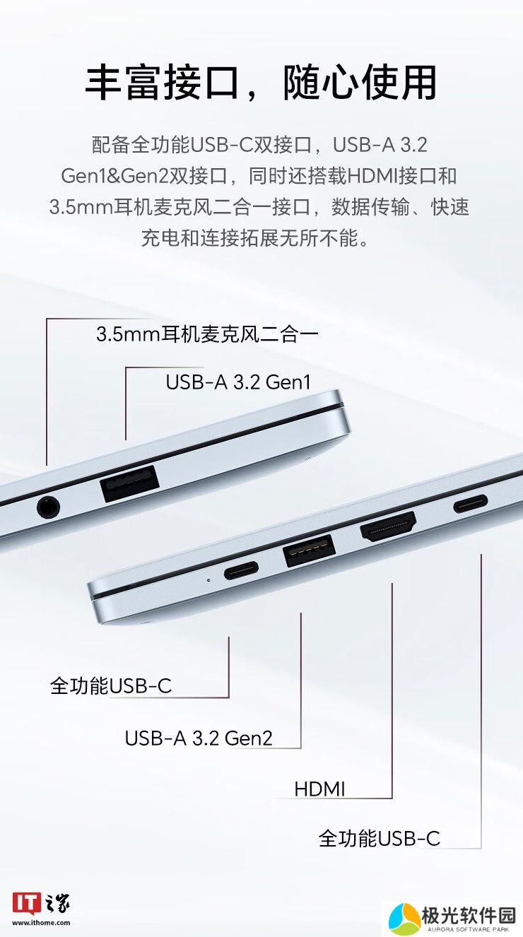 接口方面,2025 款荣耀笔记本X16 Plus 左侧同样配备2个“全功能”USB-C接口、1个 USB-A 3.2 Gen 2接口、1个 HDMI接口;右侧配备1个 3.5mm音频接口、1个 USB-A 3.2 Gen 1接口。