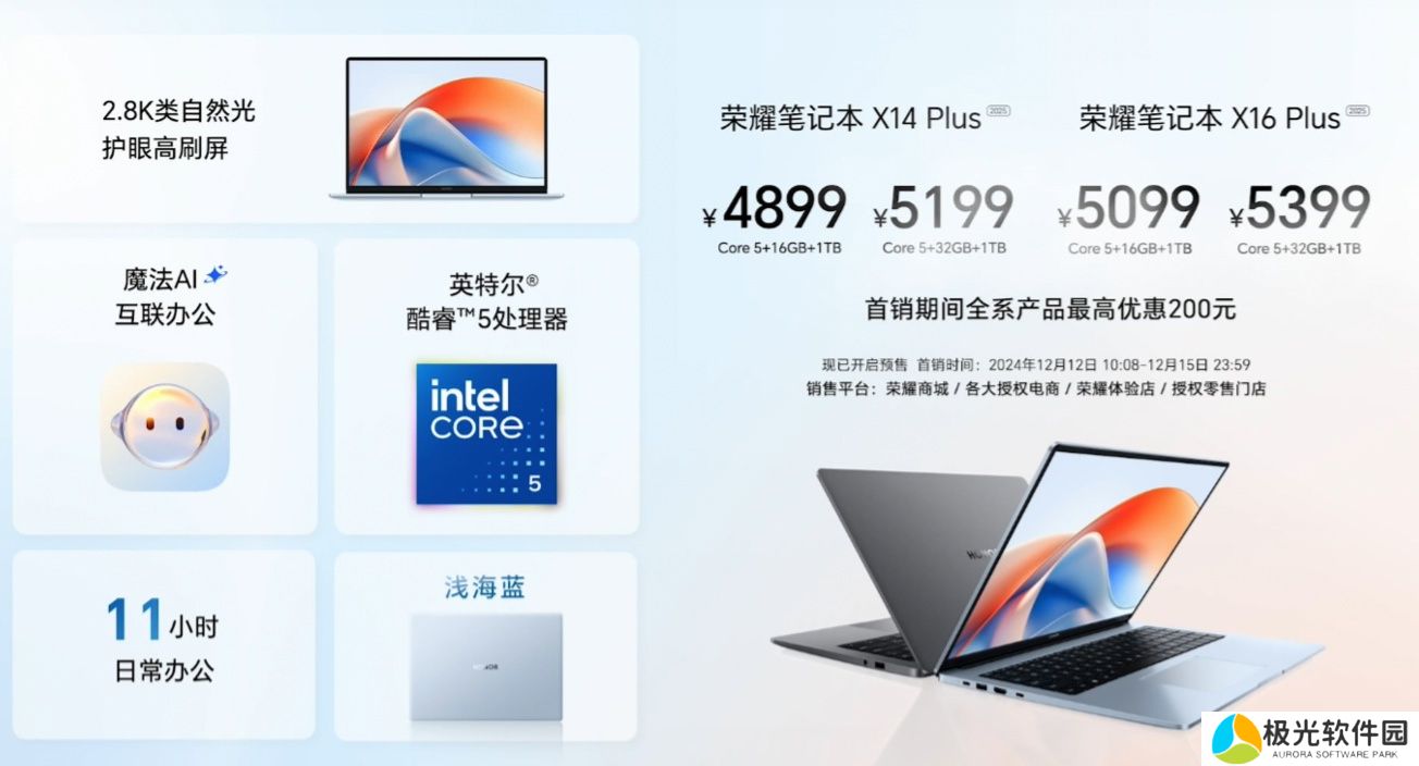 系列笔记本均搭载12核心16线程英特尔酷睿 5-220H处理器,支持荣耀魔法AI,号称日常办公约11小时。