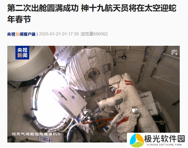 据中国载人航天工程办公室消息,北京时间 2025 年 1 月 21 日 1 时 12 分,经过约 8.5 小时的出舱活动,神舟十九号乘组航天员蔡旭哲、宋令东、王浩泽密切协同,在空间站机械臂和地面科研人员的配合支持下,完成了空间站空间碎片防护装置安装、舱外设备设施巡检等任务。出舱航天员蔡旭哲、宋令东已安全返回问天实验舱,出舱活动取得**成功。