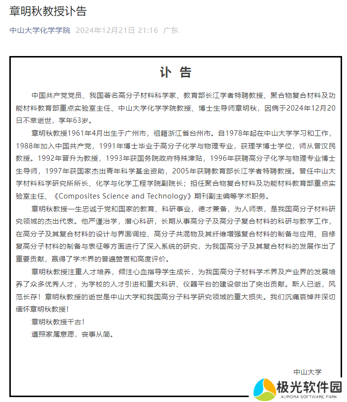 本站 12 月 21 日消息,中山大学化学学院发布讣告:我国著名高分子材料科学家、教育部长江学者特聘教授、聚合物复合材料及功能材料教育部重点实验室主任、中山大学化学学院教授、博士生导师章明秋,因病于 2024 年 12 月 20 日不幸逝世,享年 63 岁。