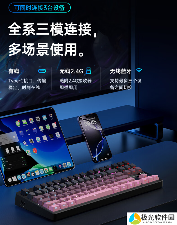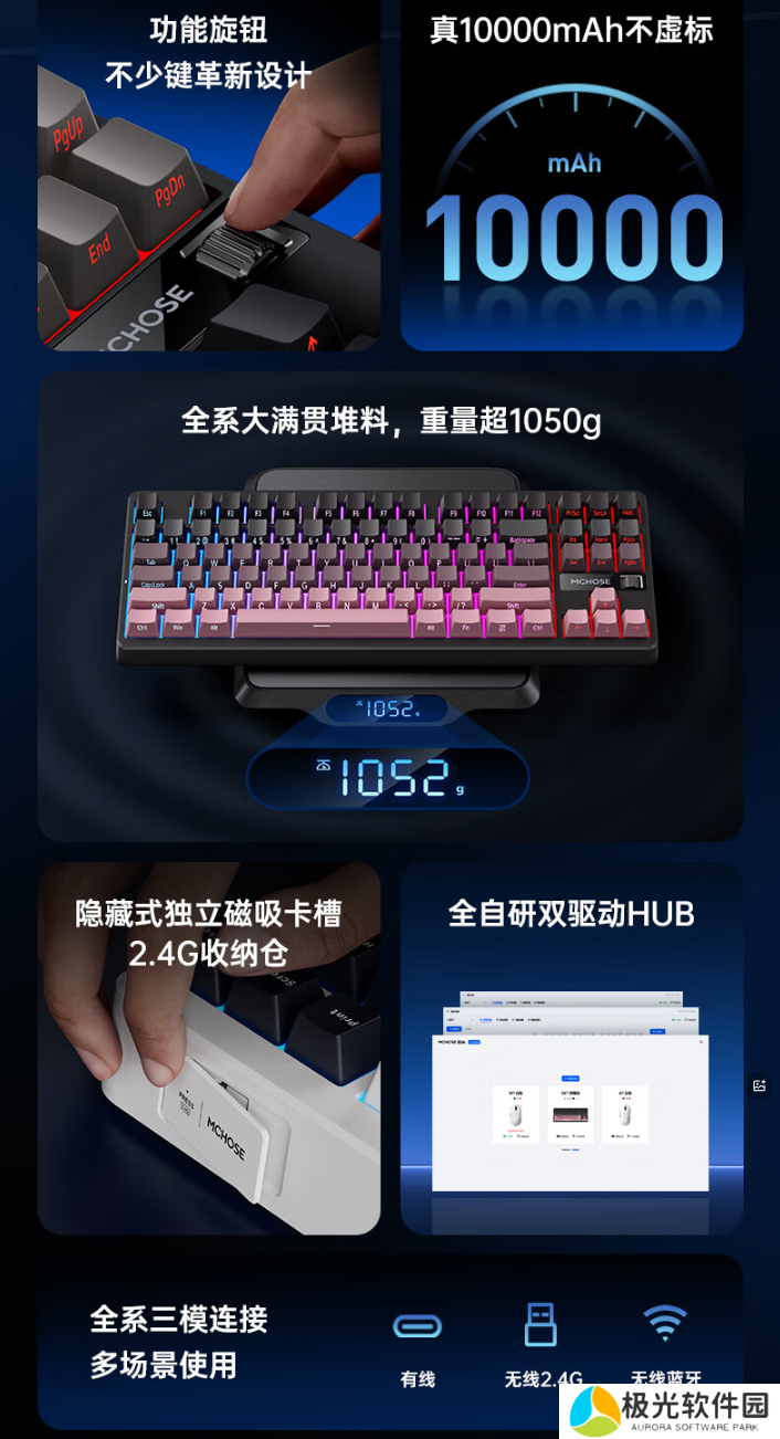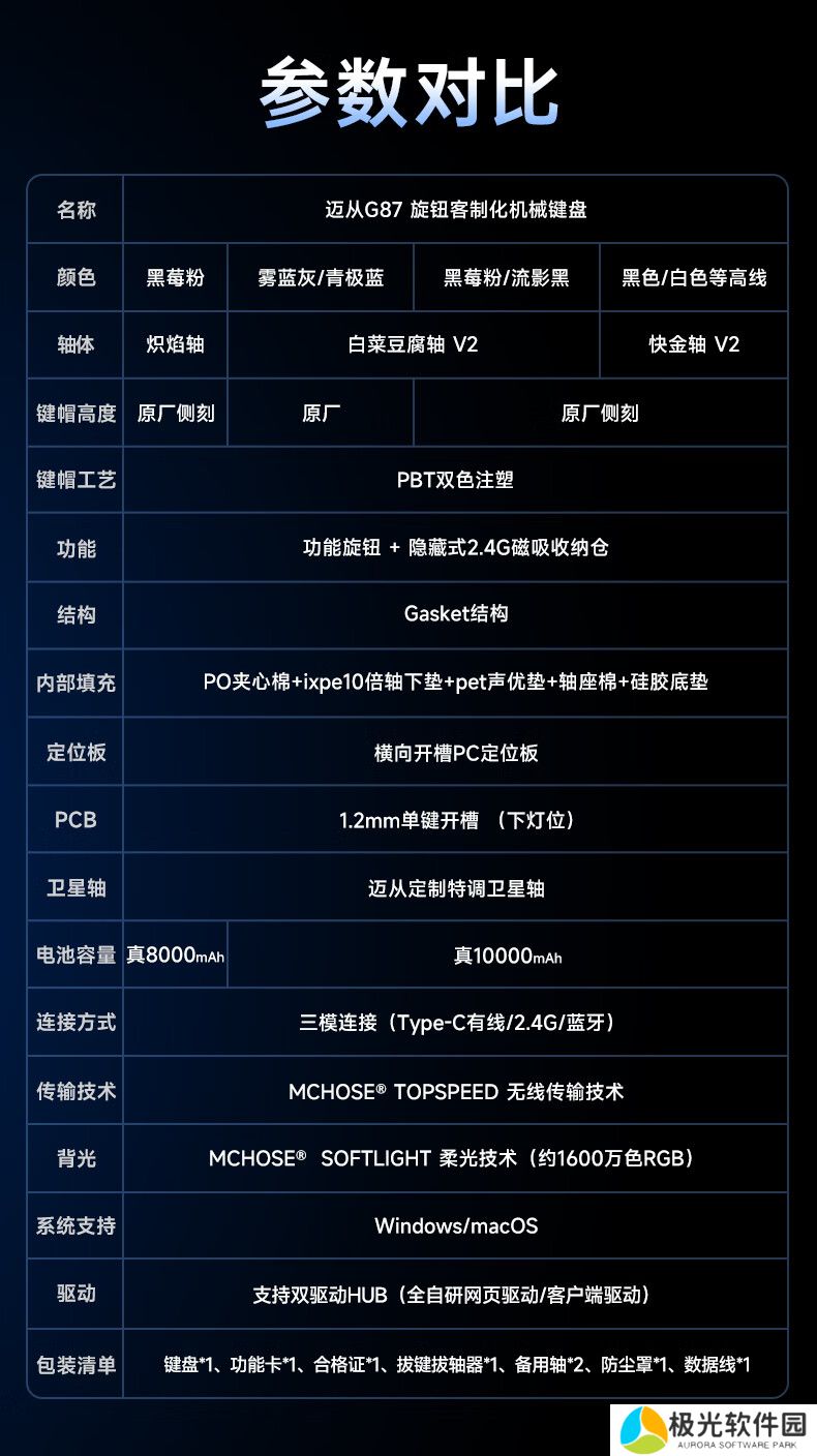 据介绍,迈从 G87 机械键盘电池容量最大为 10000mAh;支持有线 / 2.4G / 蓝牙三模连接,其配有隐藏式独立磁吸卡槽 2.4G 收纳仓,支持网页 / 客户端驱动;另外,键盘的音量旋钮则位于方向键右上处。