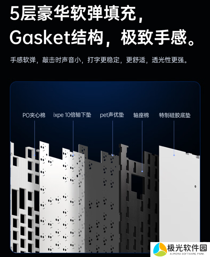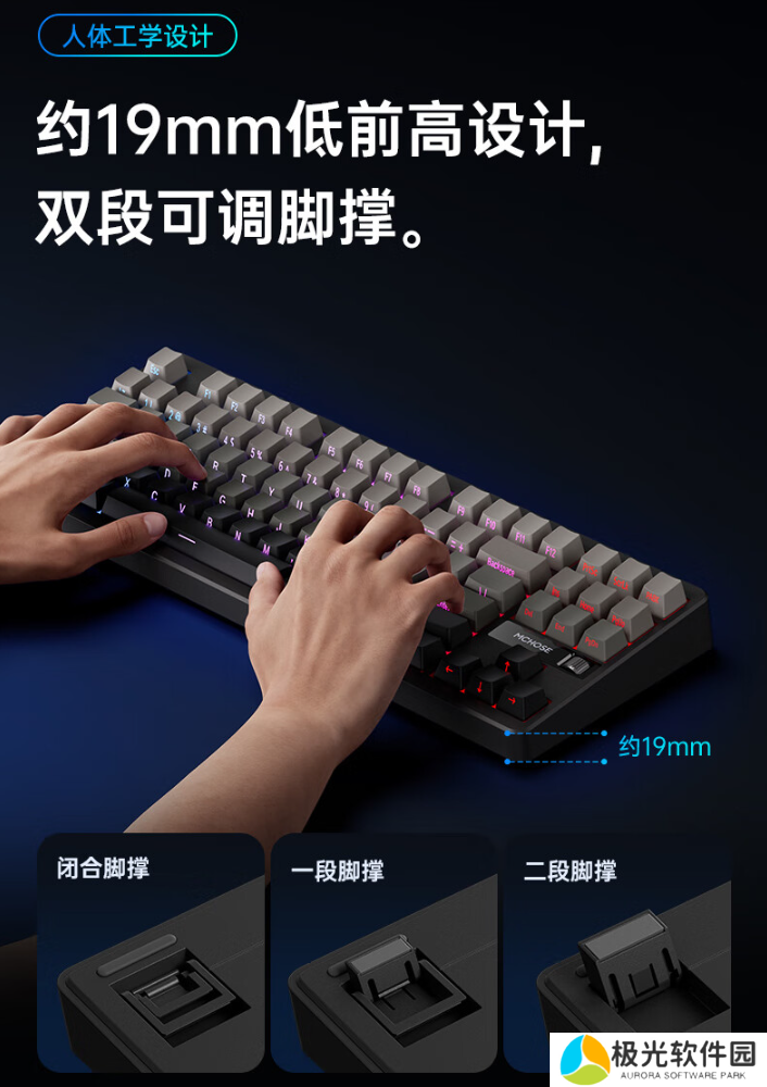 迈从 G87 机械键盘采用 Gasket 结构设计,拥有 PO 夹心棉 + ixpe 10 倍轴下垫 + pet 声优垫 + 轴座棉 + 特制硅胶底垫五层填充;键盘前高 19mm,同时配有两段可调脚撑。