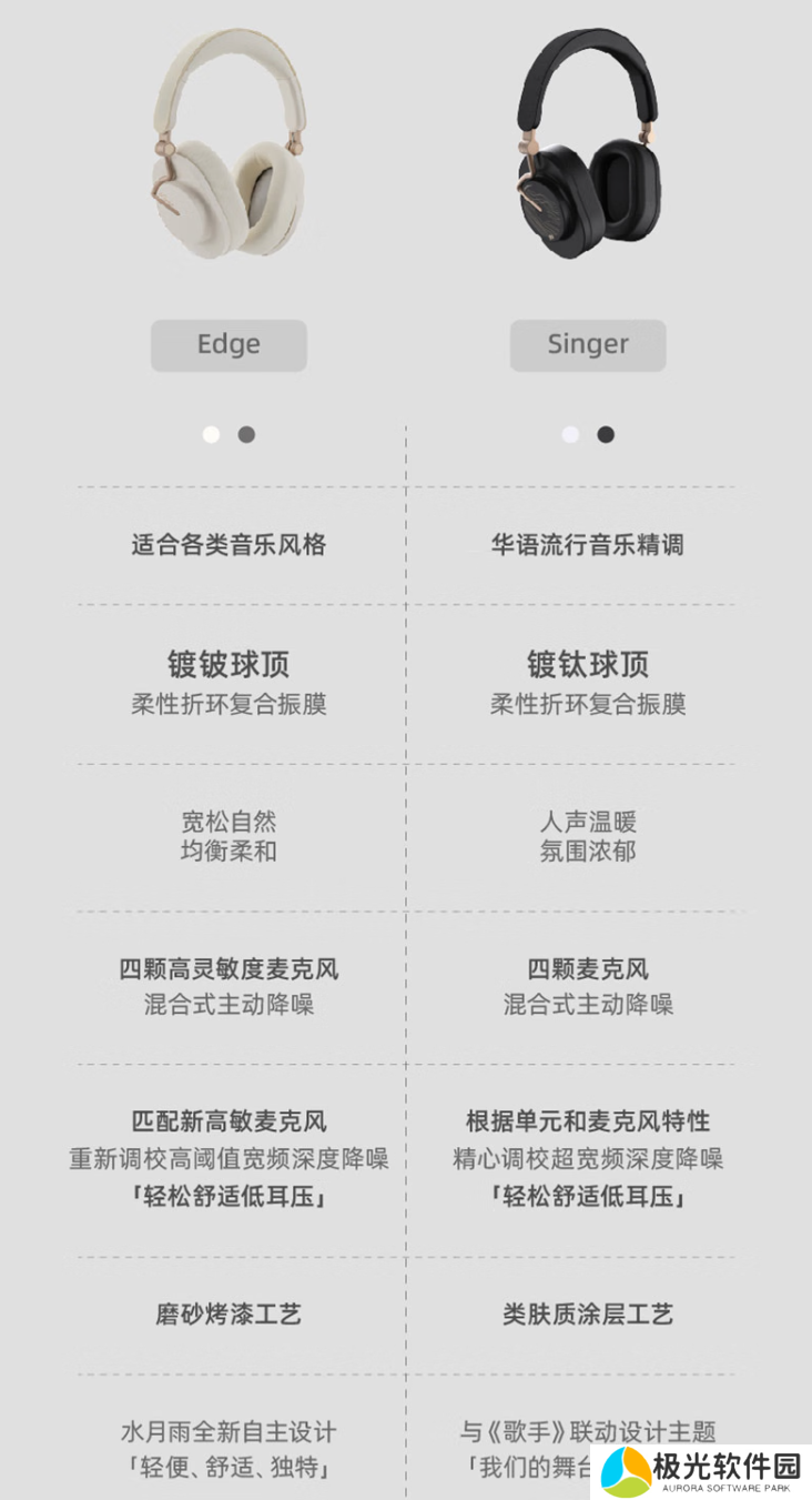 据介绍,水月雨羽翼系列头戴式耳机拥有 Edge 和 Singer 两款配色,两款耳机整体配置相似,在适用音乐类型、制作工艺等方面有所区别。