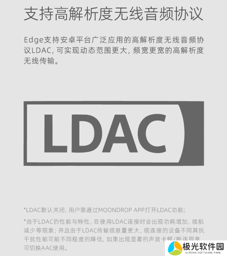 水月雨「羽翼 Edge」头戴式耳机支持 LDAC 高解析度无线音频协议,可提供复杂信号环境 50 米以上传输距离,支持双设备连接。耳机拥有约 48 小时续航,宣称“充电 5 分钟听歌 4 小时”。