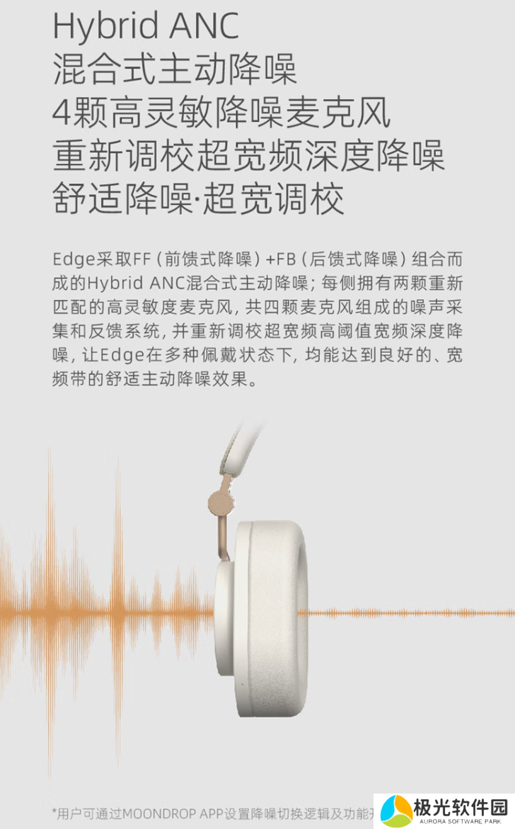 该款耳机拥有 40mm 动圈单元 +镀铍球顶柔性折环复合振膜 +4 颗降噪麦克风,支持宽频混合式主动降噪、波束成型 ENC 通话降噪等功能,并提供透传模式。